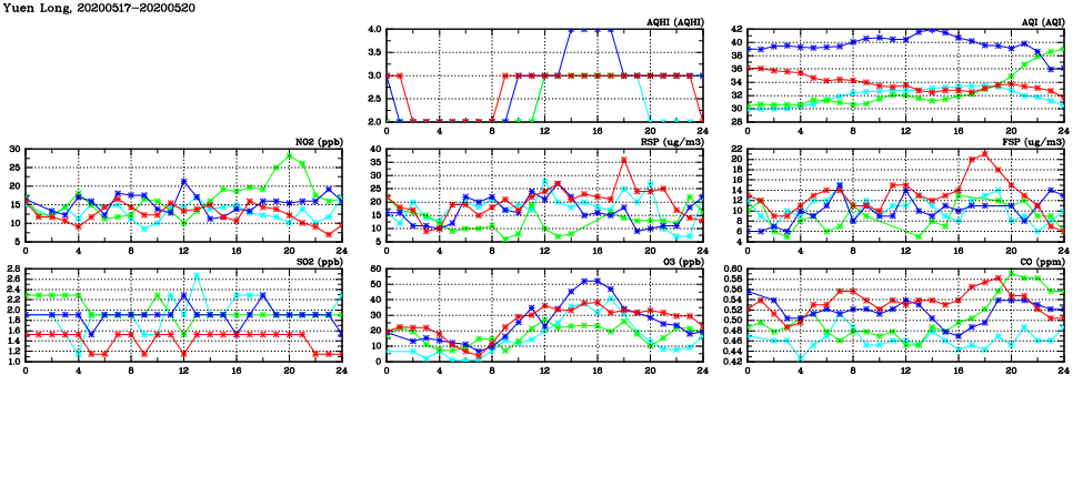 | Air Quality Data Time Series in Yuen Long (2020/05/20) | ( Line colors: Day -3 Day -2 Day -1 Current day ) | 2D Map Current AQHI |
