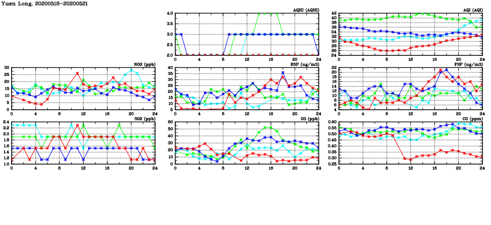 | Air Quality Data Time Series in Yuen Long (2020/05/21) | ( Line colors: Day -3 Day -2 Day -1 Current day ) | 2D Map Current AQHI |