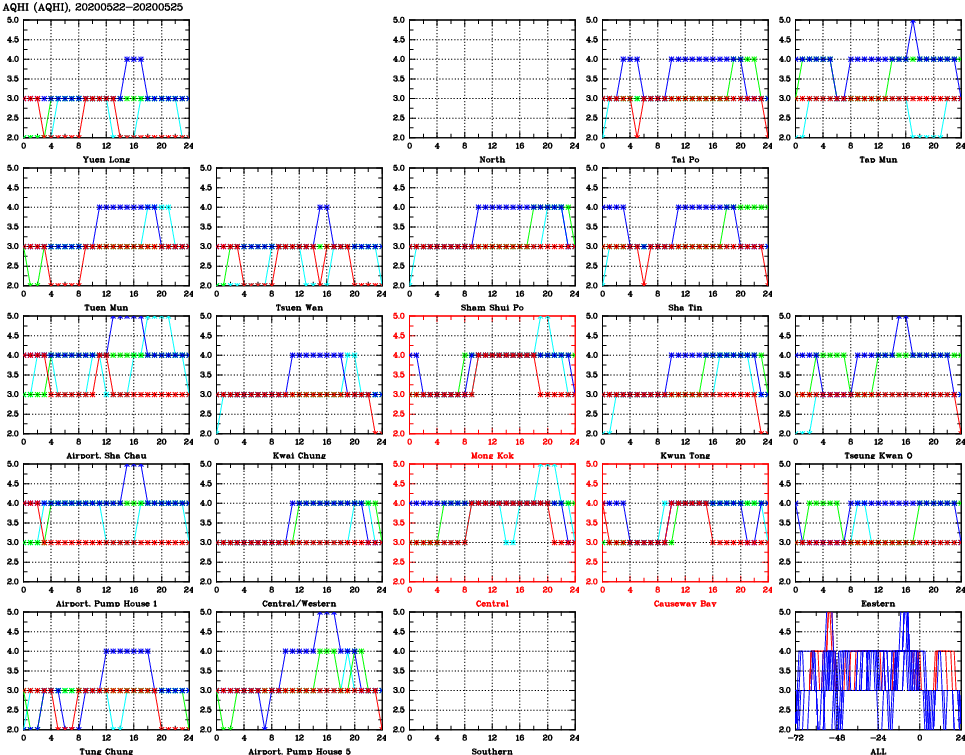 | Air Quality Data Time Series for AQHI (2020/05/25) | ( Line colors: Day -3 Day -2 Day -1 Current day ) | 2D Map Current AQHI |