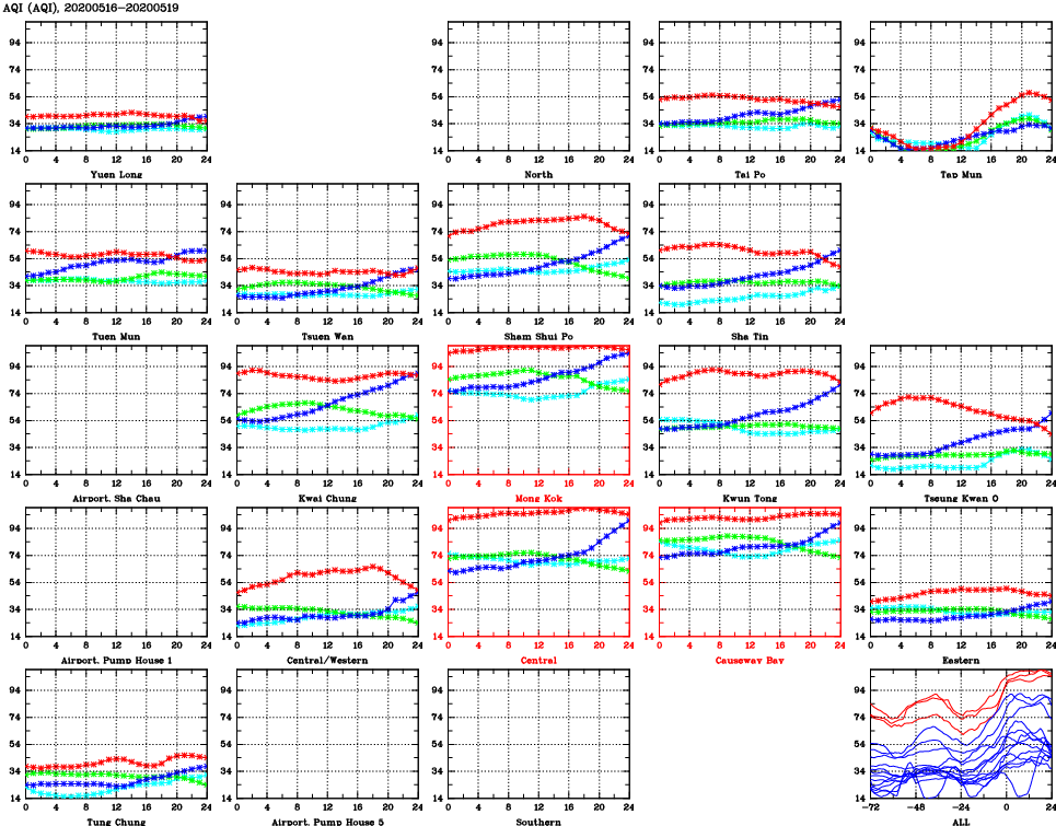 | Air Quality Data Time Series for AQI (2020/05/19) | ( Line colors: Day -3 Day -2 Day -1 Current day ) | 2D Map Current AQHI |