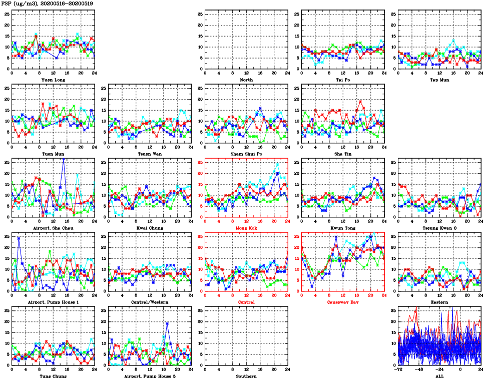| Air Quality Data Time Series for FSP (2020/05/19) | ( Line colors: Day -3 Day -2 Day -1 Current day ) | 2D Map Current AQHI |