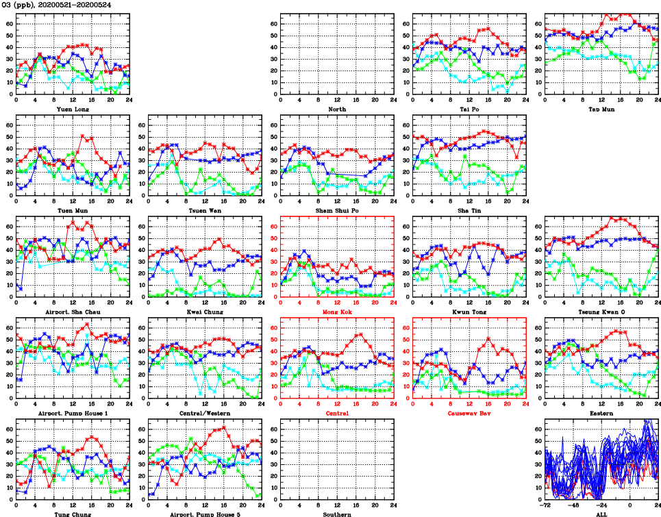 | Air Quality Data Time Series for O3 (2020/05/24) | ( Line colors: Day -3 Day -2 Day -1 Current day ) | 2D Map Current AQHI |