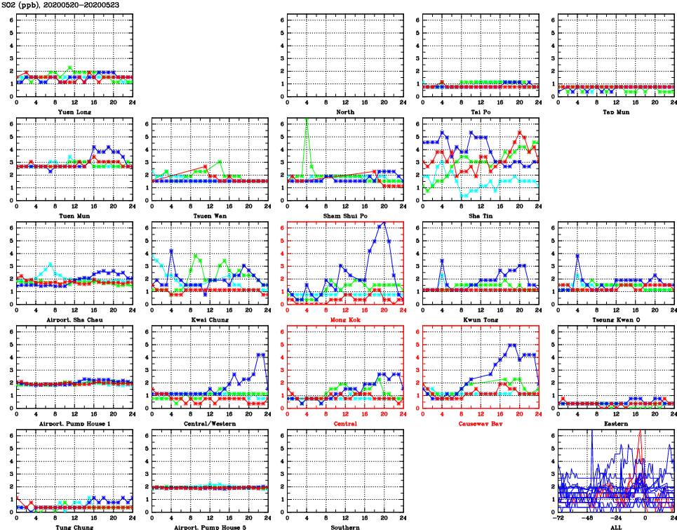 | Air Quality Data Time Series for SO2 (2020/05/23) | ( Line colors: Day -3 Day -2 Day -1 Current day ) | 2D Map Current AQHI |
