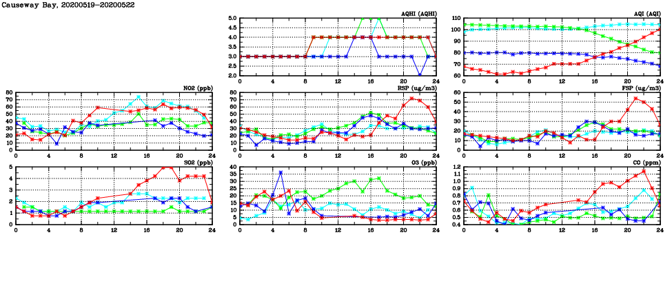 | Air Quality Data Time Series in Causeway Bay (2020/05/22) | ( Line colors: Day -3 Day -2 Day -1 Current day ) | 2D Map Current AQHI |
