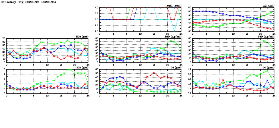| Air Quality Data Time Series in Causeway Bay (2020/05/24) | ( Line colors: Day -3 Day -2 Day -1 Current day ) | 2D Map Current AQHI |