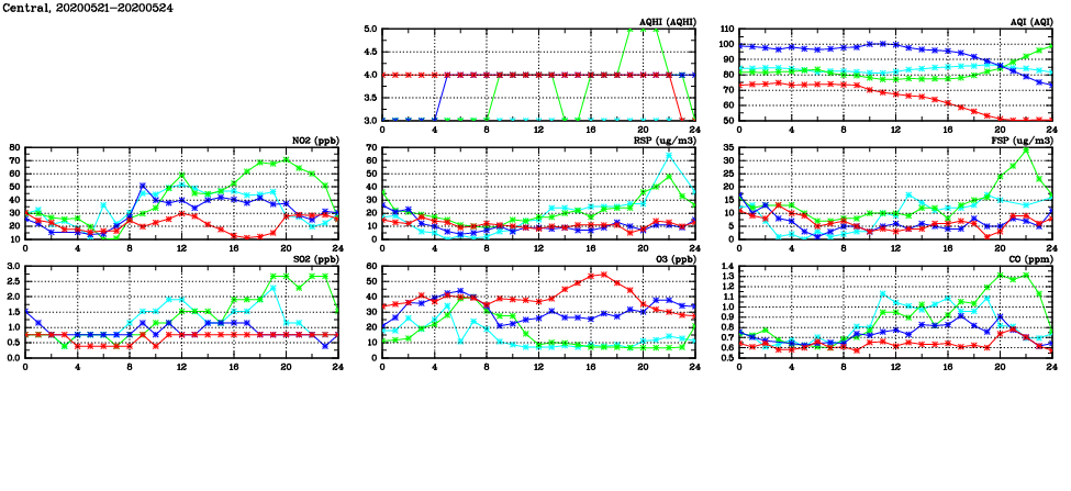 | Air Quality Data Time Series in Central (2020/05/24) | ( Line colors: Day -3 Day -2 Day -1 Current day ) | 2D Map Current AQHI |