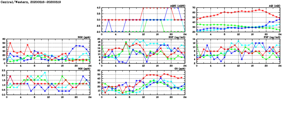 | Air Quality Data Time Series in Central/Western (2020/05/19) | ( Line colors: Day -3 Day -2 Day -1 Current day ) | 2D Map Current AQHI |