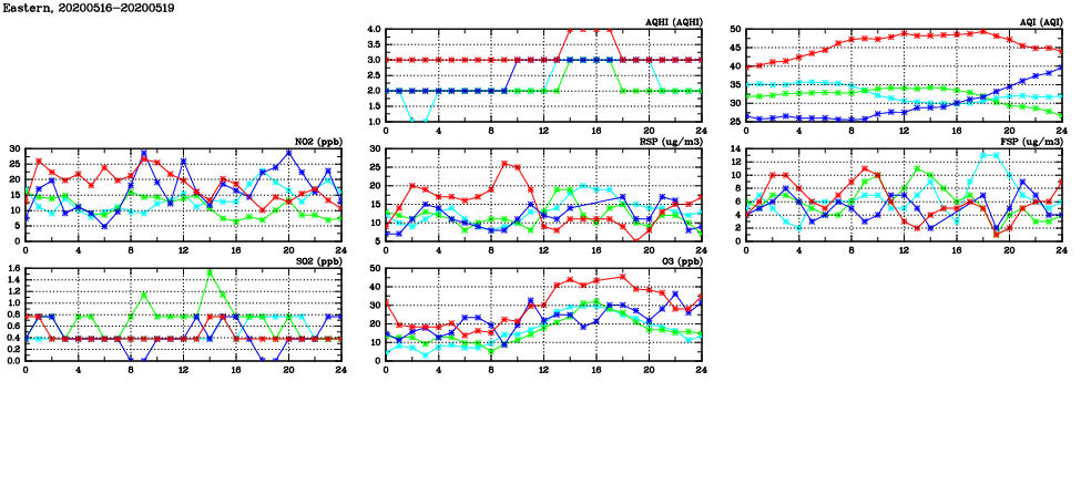 | Air Quality Data Time Series in Eastern (2020/05/19) | ( Line colors: Day -3 Day -2 Day -1 Current day ) | 2D Map Current AQHI |