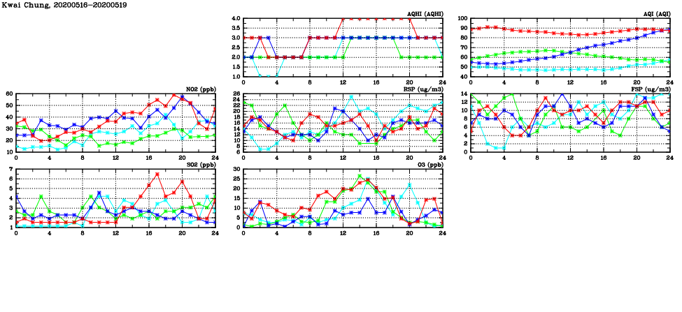 | Air Quality Data Time Series in Kwai Chung (2020/05/19) | ( Line colors: Day -3 Day -2 Day -1 Current day ) | 2D Map Current AQHI |