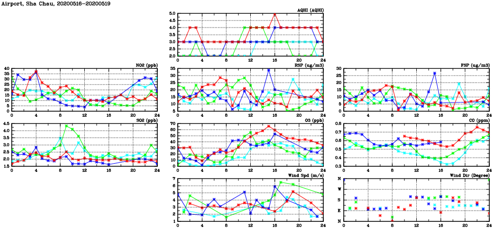 | Air Quality Data Time Series in Airport, Sha Chau (2020/05/19) | ( Line colors: Day -3 Day -2 Day -1 Current day ) | 2D Map Current AQHI |