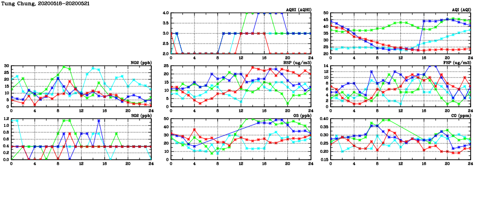 | Air Quality Data Time Series in Tung Chung (2020/05/21) | ( Line colors: Day -3 Day -2 Day -1 Current day ) | 2D Map Current AQHI |