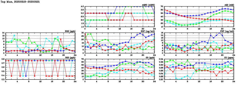 | Air Quality Data Time Series in Tap Mun (2020/05/21) | ( Line colors: Day -3 Day -2 Day -1 Current day ) | 2D Map Current AQHI |