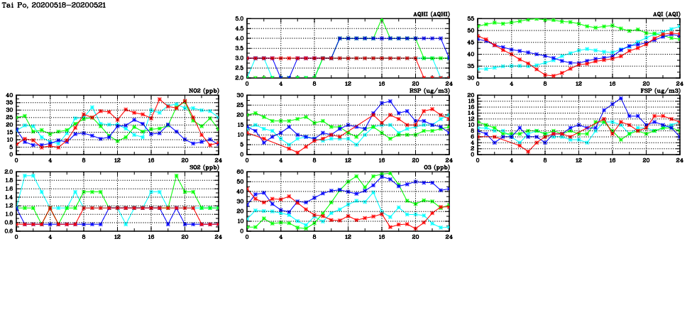 | Air Quality Data Time Series in Tai Po (2020/05/21) | ( Line colors: Day -3 Day -2 Day -1 Current day ) | 2D Map Current AQHI |