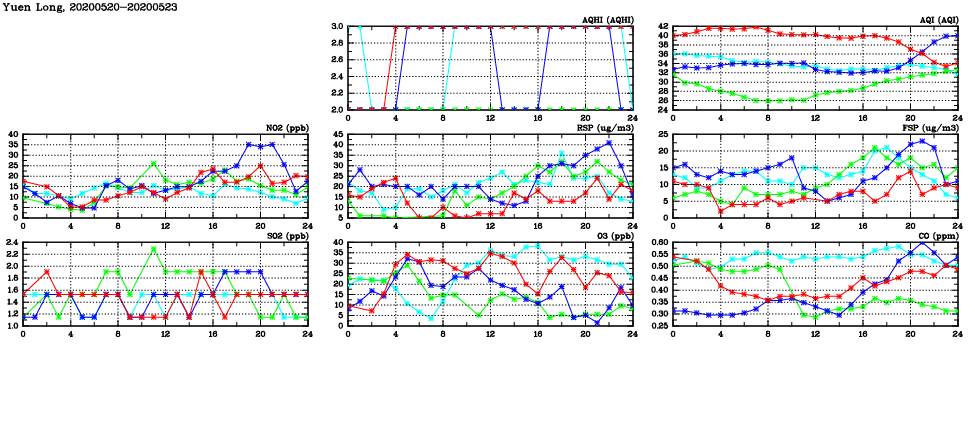 | Air Quality Data Time Series in Yuen Long (2020/05/23) | ( Line colors: Day -3 Day -2 Day -1 Current day ) | 2D Map Current AQHI |