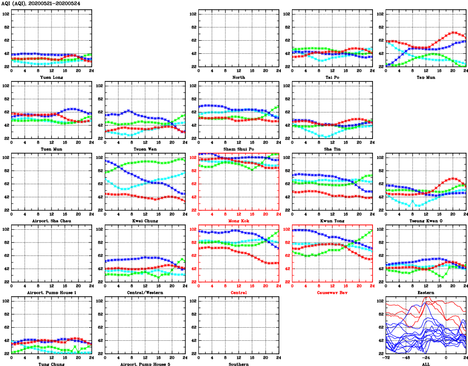 | Air Quality Data Time Series for AQI (2020/05/24) | ( Line colors: Day -3 Day -2 Day -1 Current day ) | 2D Map Current AQHI |