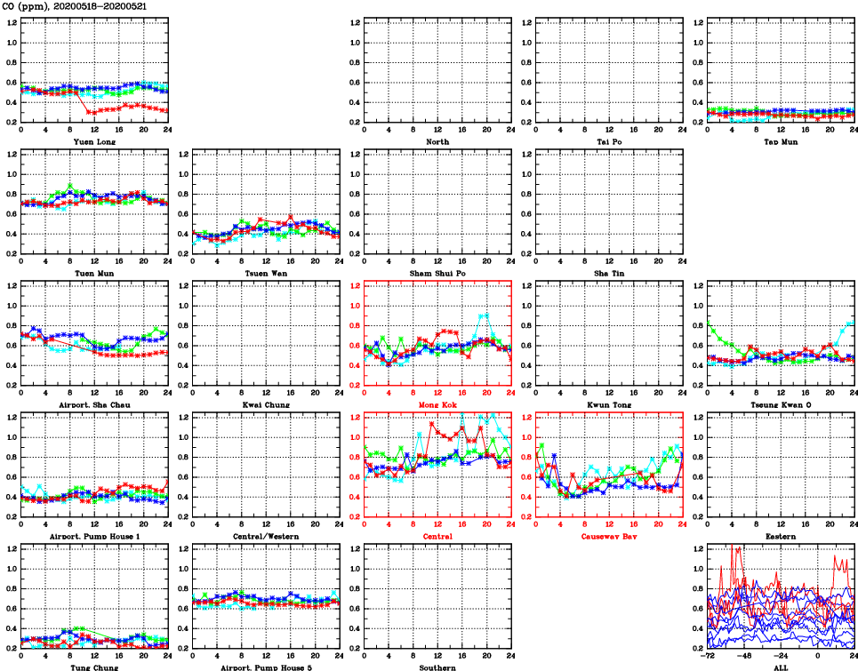 | Air Quality Data Time Series for CO (2020/05/21) | ( Line colors: Day -3 Day -2 Day -1 Current day ) | 2D Map Current AQHI |