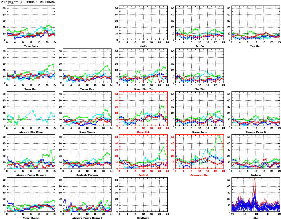 | Air Quality Data Time Series for FSP (2020/05/24) | ( Line colors: Day -3 Day -2 Day -1 Current day ) | 2D Map Current AQHI |