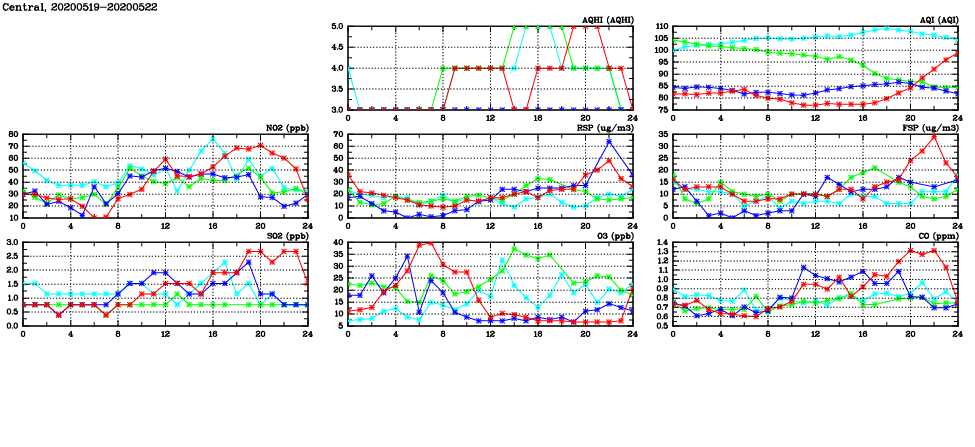 | Air Quality Data Time Series in Central (2020/05/22) | ( Line colors: Day -3 Day -2 Day -1 Current day ) | 2D Map Current AQHI |