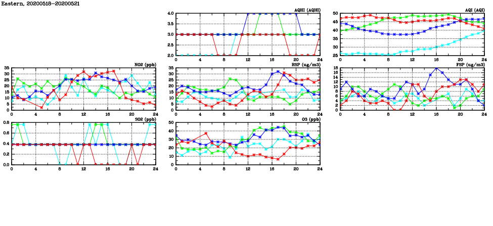 | Air Quality Data Time Series in Eastern (2020/05/21) | ( Line colors: Day -3 Day -2 Day -1 Current day ) | 2D Map Current AQHI |