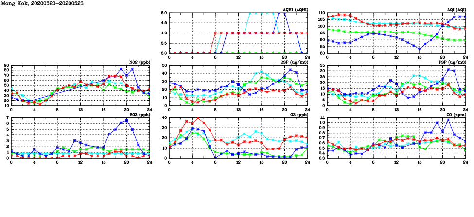 | Air Quality Data Time Series in Mong Kok (2020/05/23) | ( Line colors: Day -3 Day -2 Day -1 Current day ) | 2D Map Current AQHI |