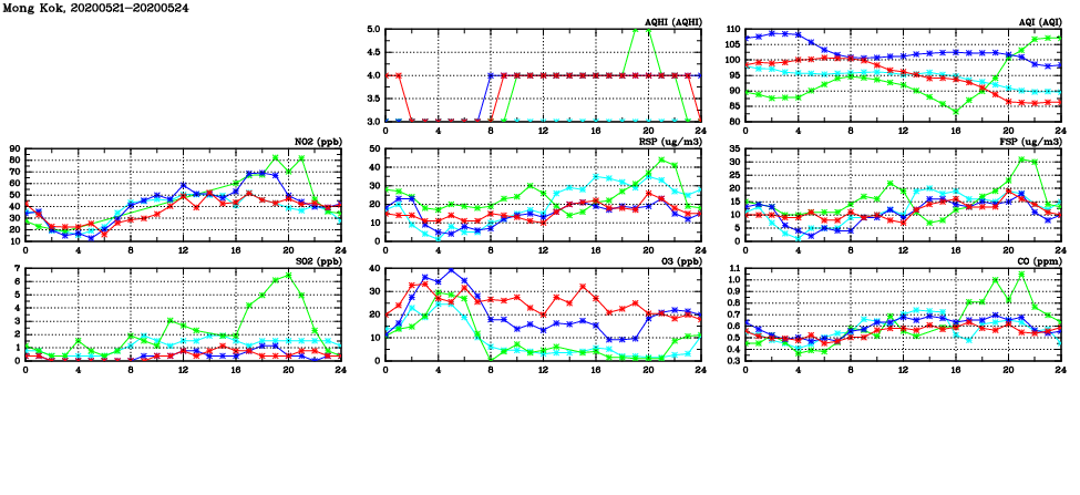 | Air Quality Data Time Series in Mong Kok (2020/05/24) | ( Line colors: Day -3 Day -2 Day -1 Current day ) | 2D Map Current AQHI |