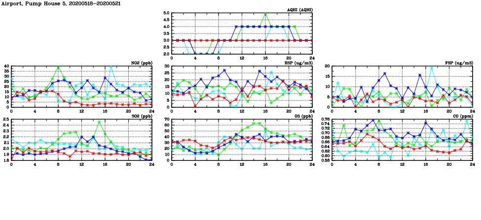 | Air Quality Data Time Series in Airport, Pump House 5 (2020/05/21) | ( Line colors: Day -3 Day -2 Day -1 Current day ) | 2D Map Current AQHI |