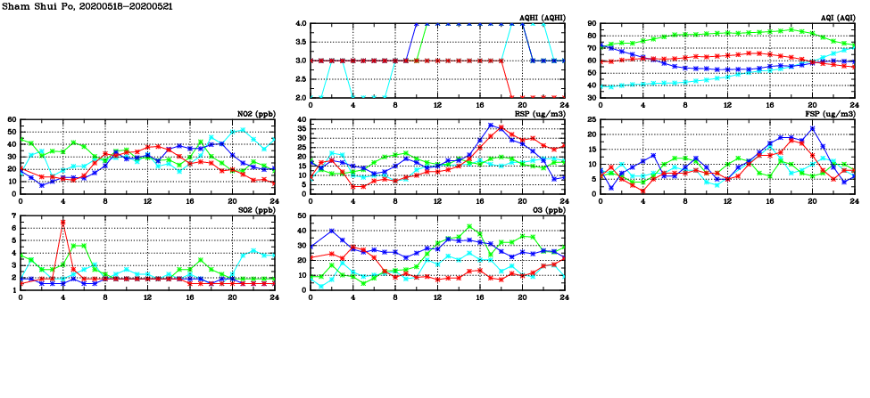 | Air Quality Data Time Series in Sham Shui Po (2020/05/21) | ( Line colors: Day -3 Day -2 Day -1 Current day ) | 2D Map Current AQHI |