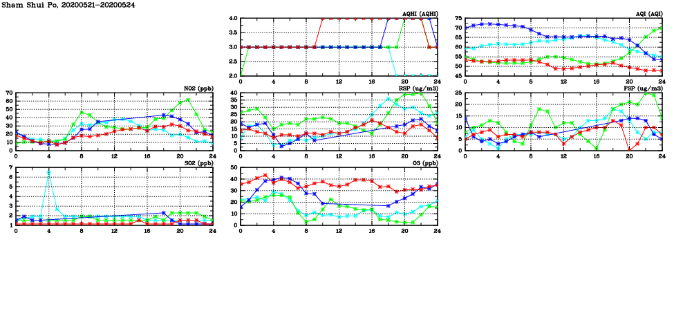 | Air Quality Data Time Series in Sham Shui Po (2020/05/24) | ( Line colors: Day -3 Day -2 Day -1 Current day ) | 2D Map Current AQHI |