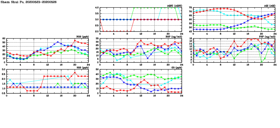 | Air Quality Data Time Series in Sham Shui Po (2020/05/26) | ( Line colors: Day -3 Day -2 Day -1 Current day ) | 2D Map Current AQHI |