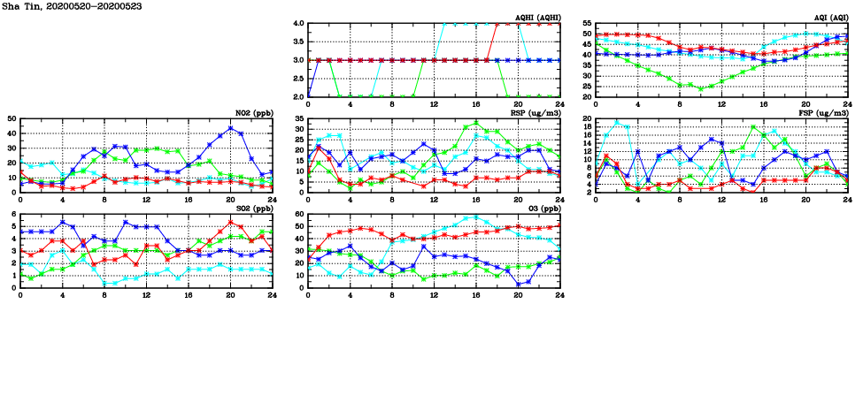 | Air Quality Data Time Series in Sha Tin (2020/05/23) | ( Line colors: Day -3 Day -2 Day -1 Current day ) | 2D Map Current AQHI |