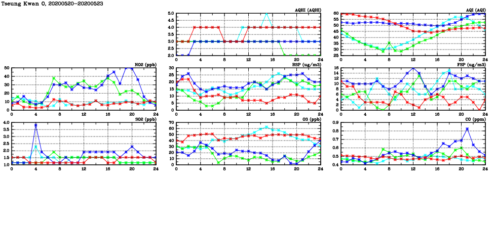 | Air Quality Data Time Series in Tseung Kwan O (2020/05/23) | ( Line colors: Day -3 Day -2 Day -1 Current day ) | 2D Map Current AQHI |
