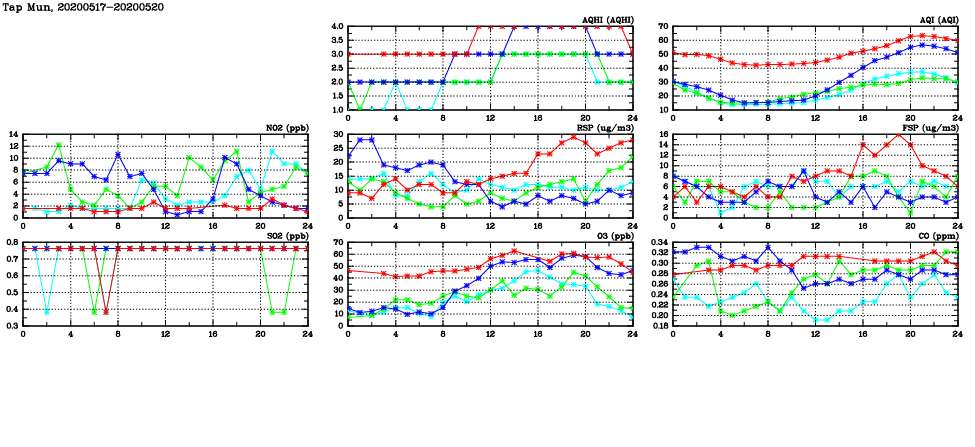 | Air Quality Data Time Series in Tap Mun (2020/05/20) | ( Line colors: Day -3 Day -2 Day -1 Current day ) | 2D Map Current AQHI |