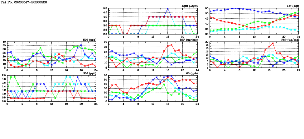 | Air Quality Data Time Series in Tai Po (2020/05/20) | ( Line colors: Day -3 Day -2 Day -1 Current day ) | 2D Map Current AQHI |