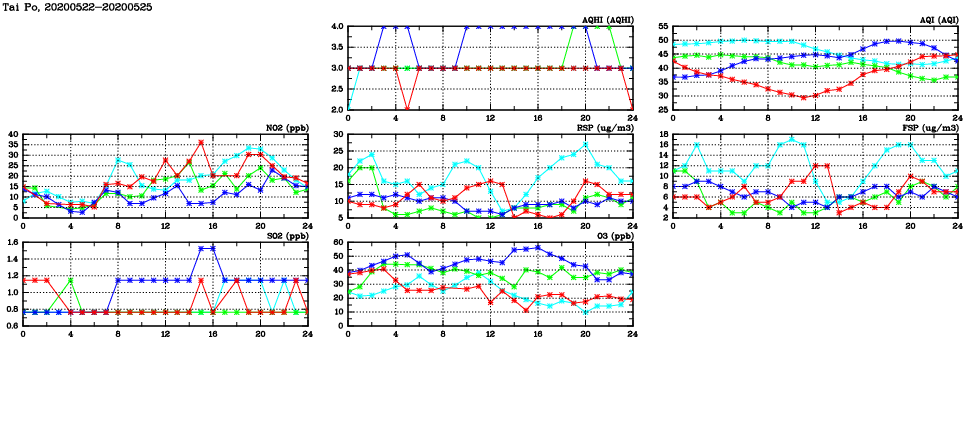 | Air Quality Data Time Series in Tai Po (2020/05/25) | ( Line colors: Day -3 Day -2 Day -1 Current day ) | 2D Map Current AQHI |