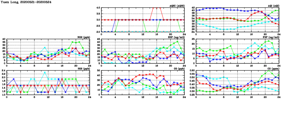 | Air Quality Data Time Series in Yuen Long (2020/05/24) | ( Line colors: Day -3 Day -2 Day -1 Current day ) | 2D Map Current AQHI |