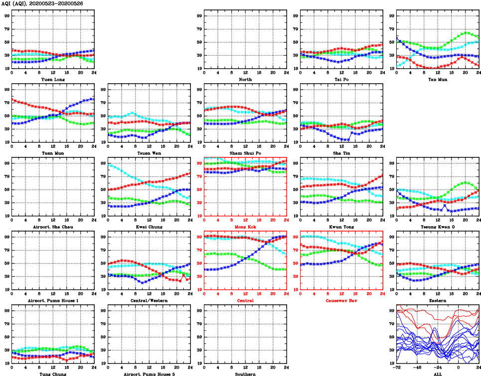 | Air Quality Data Time Series for AQI (2020/05/26) | ( Line colors: Day -3 Day -2 Day -1 Current day ) | 2D Map Current AQHI |