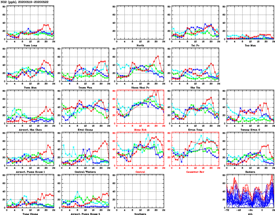| Air Quality Data Time Series for NO2 (2020/05/22) | ( Line colors: Day -3 Day -2 Day -1 Current day ) | 2D Map Current AQHI |