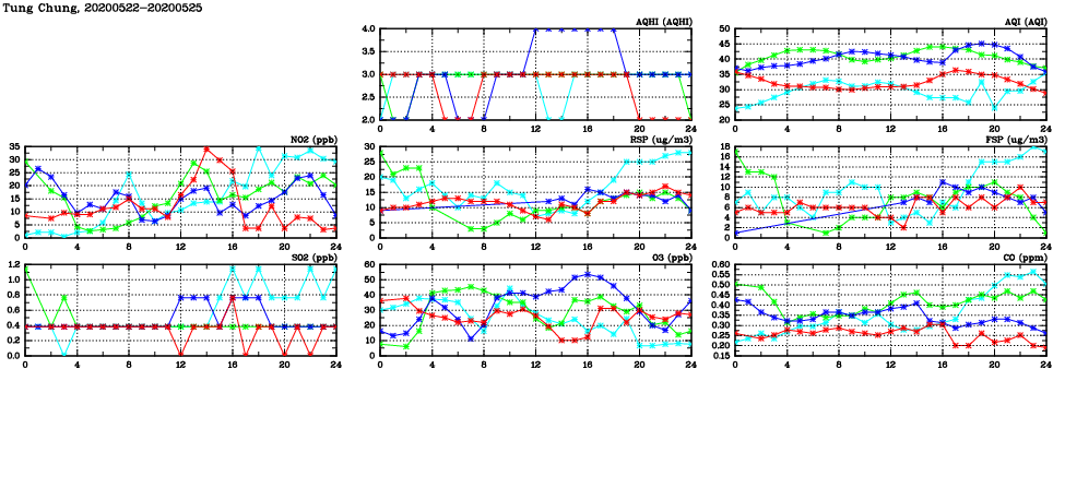 | Air Quality Data Time Series in Tung Chung (2020/05/25) | ( Line colors: Day -3 Day -2 Day -1 Current day ) | 2D Map Current AQHI |