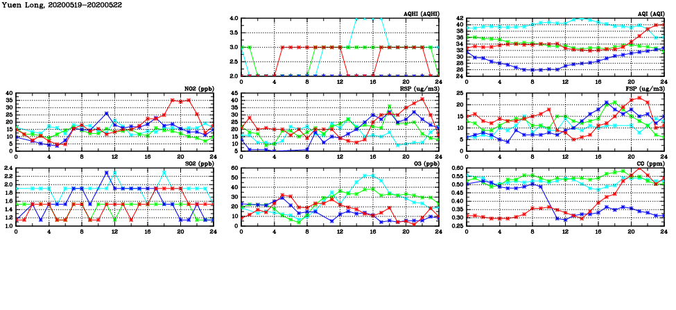 | Air Quality Data Time Series in Yuen Long (2020/05/22) | ( Line colors: Day -3 Day -2 Day -1 Current day ) | 2D Map Current AQHI |
