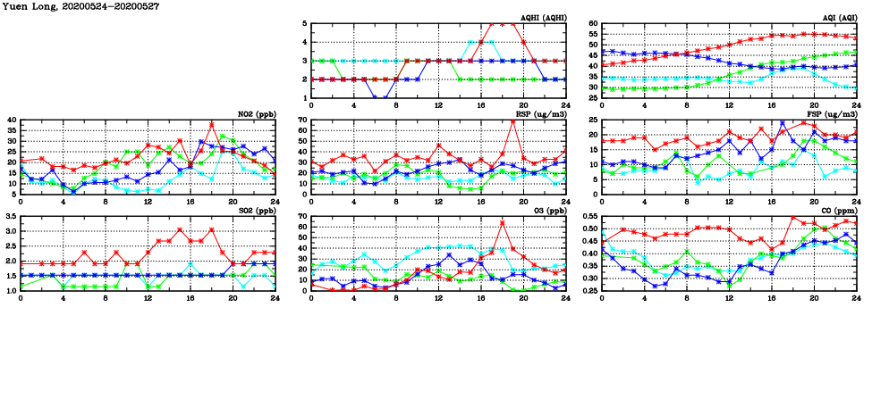 | Air Quality Data Time Series in Yuen Long (2020/05/27) | ( Line colors: Day -3 Day -2 Day -1 Current day ) | 2D Map Current AQHI |