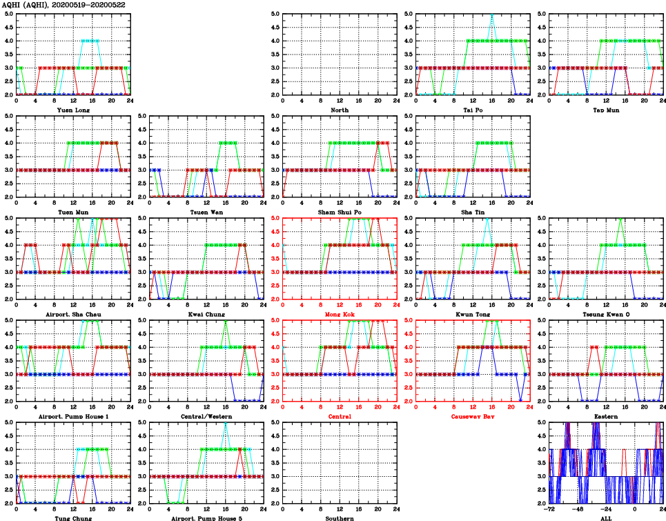 | Air Quality Data Time Series for AQHI (2020/05/22) | ( Line colors: Day -3 Day -2 Day -1 Current day ) | 2D Map Current AQHI |