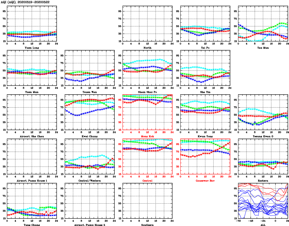 | Air Quality Data Time Series for AQI (2020/05/22) | ( Line colors: Day -3 Day -2 Day -1 Current day ) | 2D Map Current AQHI |