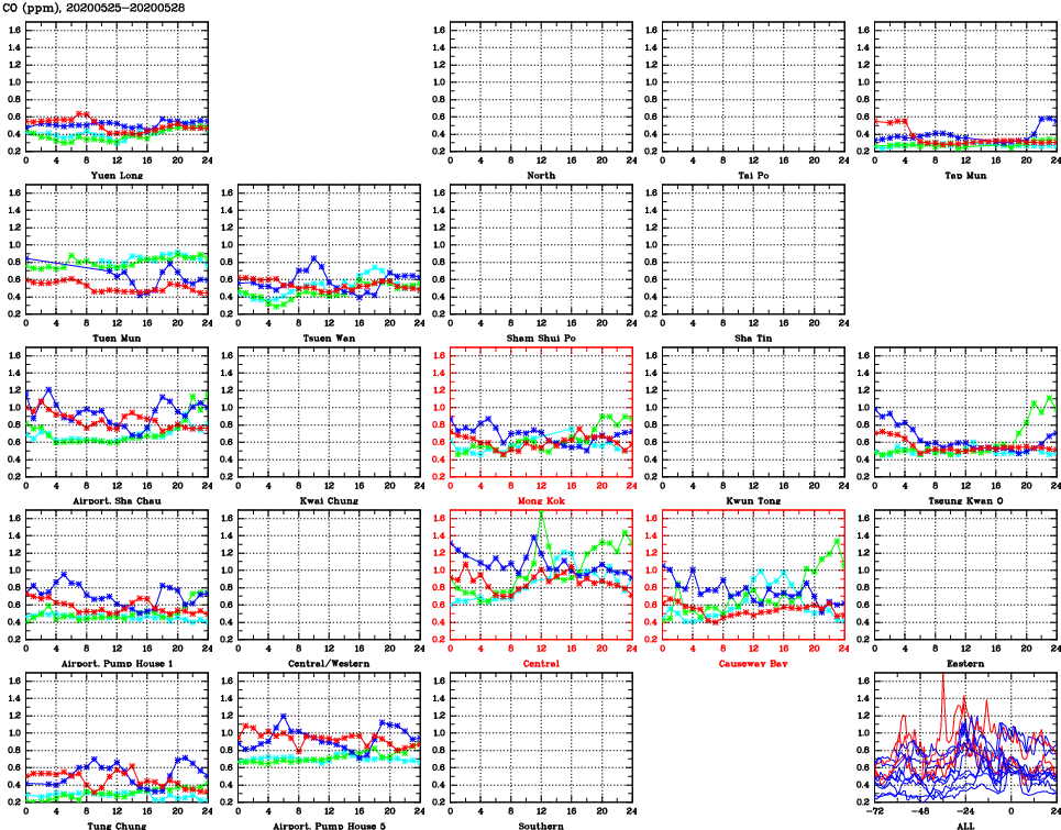 | Air Quality Data Time Series for CO (2020/05/28) | ( Line colors: Day -3 Day -2 Day -1 Current day ) | 2D Map Current AQHI |