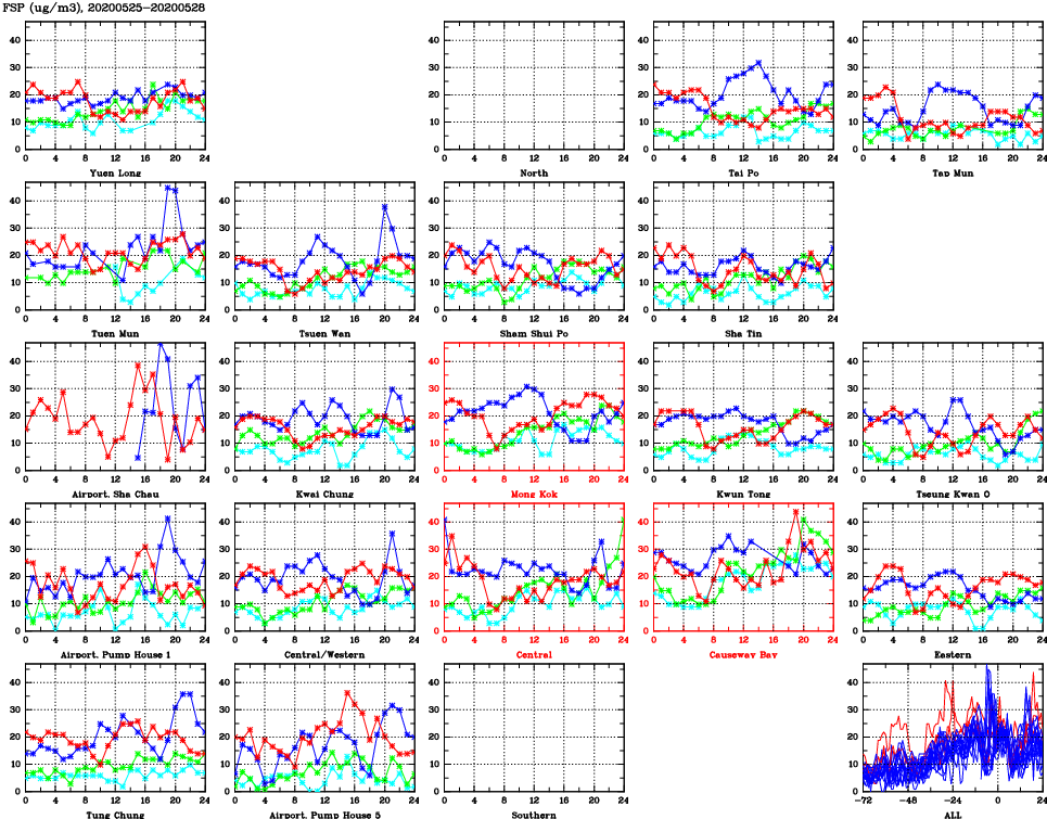 | Air Quality Data Time Series for FSP (2020/05/28) | ( Line colors: Day -3 Day -2 Day -1 Current day ) | 2D Map Current AQHI |