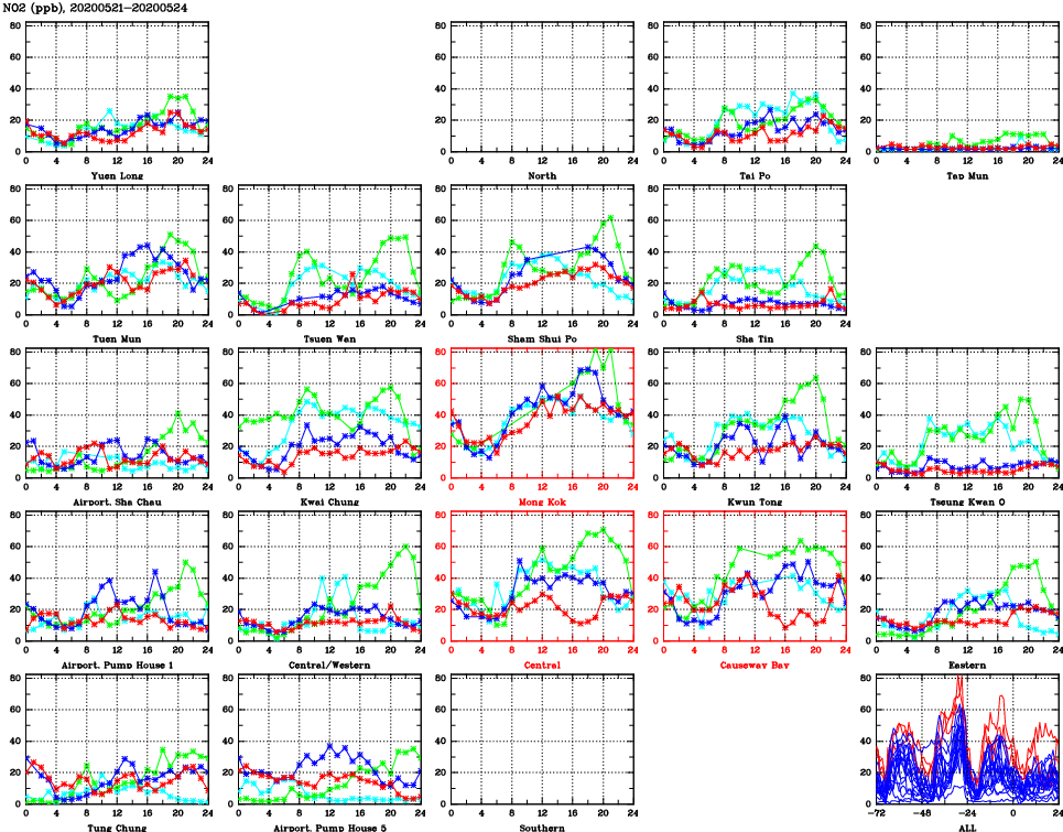 | Air Quality Data Time Series for NO2 (2020/05/24) | ( Line colors: Day -3 Day -2 Day -1 Current day ) | 2D Map Current AQHI |
