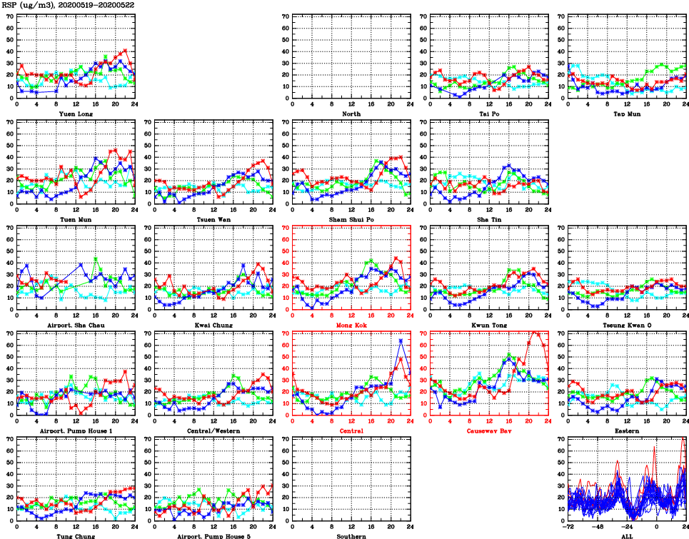 | Air Quality Data Time Series for RSP (2020/05/22) | ( Line colors: Day -3 Day -2 Day -1 Current day ) | 2D Map Current AQHI |
