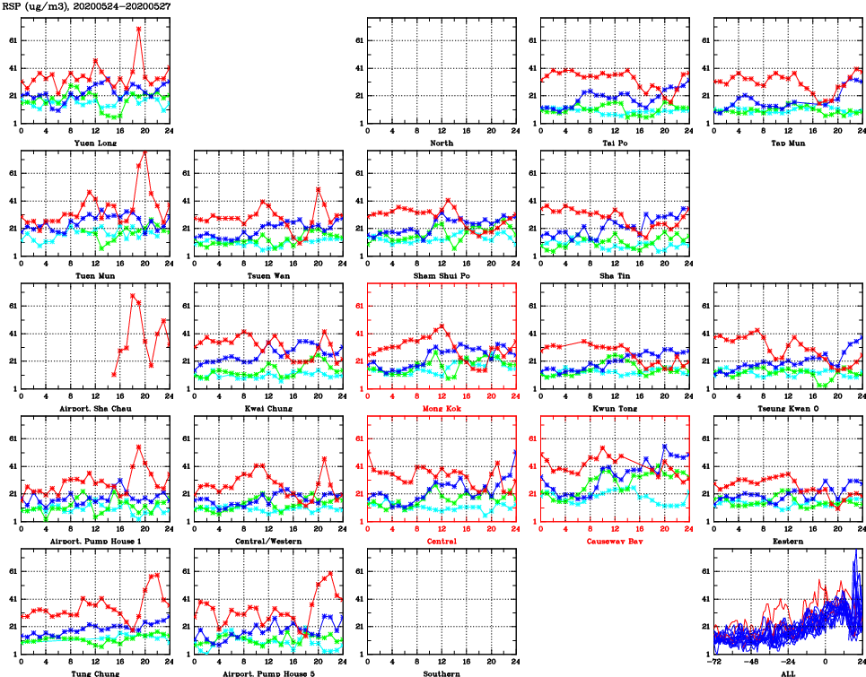 | Air Quality Data Time Series for RSP (2020/05/27) | ( Line colors: Day -3 Day -2 Day -1 Current day ) | 2D Map Current AQHI |