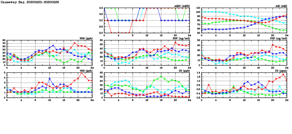 | Air Quality Data Time Series in Causeway Bay (2020/05/26) | ( Line colors: Day -3 Day -2 Day -1 Current day ) | 2D Map Current AQHI |