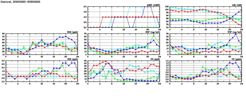 | Air Quality Data Time Series in Central (2020/05/23) | ( Line colors: Day -3 Day -2 Day -1 Current day ) | 2D Map Current AQHI |