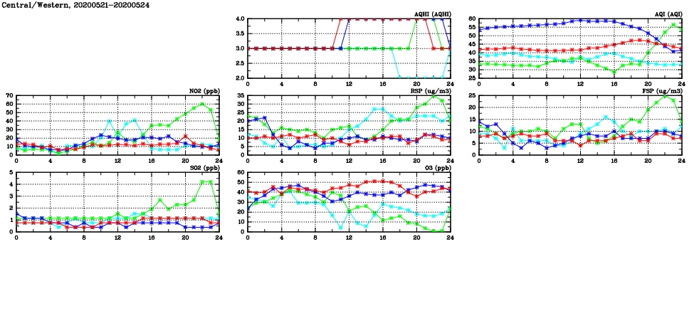 | Air Quality Data Time Series in Central/Western (2020/05/24) | ( Line colors: Day -3 Day -2 Day -1 Current day ) | 2D Map Current AQHI |